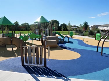 Playground Features: The playground includes various equipment such as swings, slides, climbing structures, and interactive play elements, catering to different age groups. This playground features a water and sand designed swale in the surfacing inspiring patrons of all kinds of additional play - 'watch out - Pirates!'.