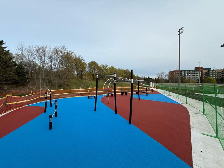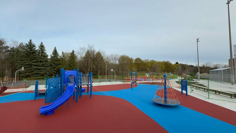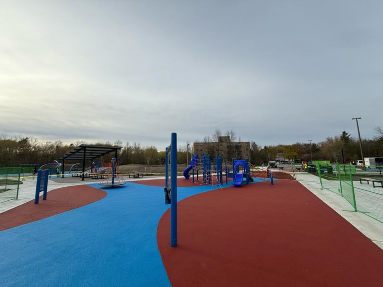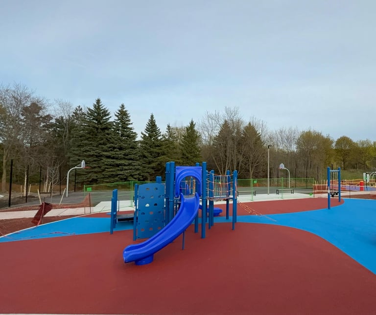 Softline Solutions is pleased to announce the successful completion of the playground surfacing project at Harding Park. The installation features a vibrant combination of two custom-colored surfacing mixes in red and blue, designed to provide a safe, durable, and visually engaging play area for the community.