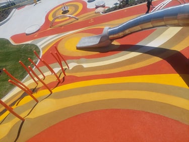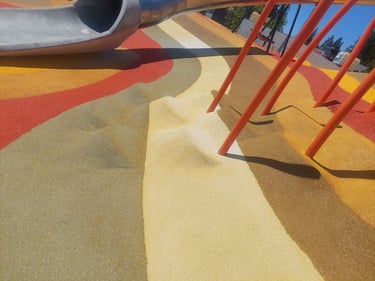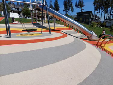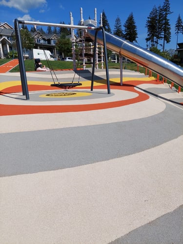 Safety Surfacing: Softline Solutions was pleased to partner with the City of Surrey to provide the complementing FirstBase playground safety surfacing. The surface line design shows the slope incline well and makes the playground pop in its surrounding design.